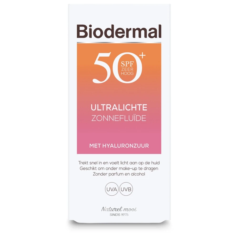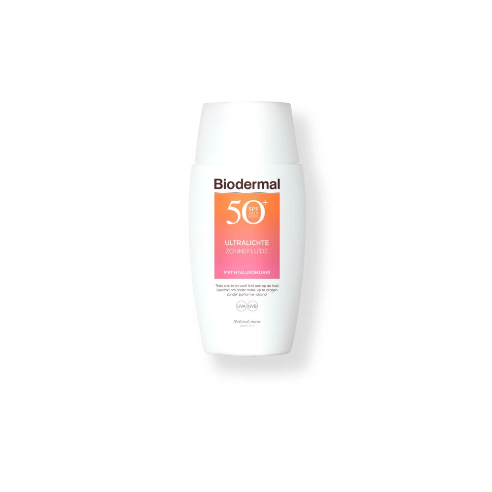 Biodermal Ultralichte Zonnefluïde SPF 50+Biodermal Ultralichte Zonnefluïde SPF 50+ voor het gezicht is geformuleerd met geavanceerde en fotostabiele UVA/UVB filters en biedt onmiddellijk zeer hoge bescherming tegen de schadelijke effecten van zonnestraling. De ultralichte fluïde met hyaluronzuur en antioxidanten hydrateert intensief, beschermt tegen invloeden van buitenaf en helpt tekenen van vroegtijdige huidveroudering, zoals pigmentvlekjes, tegen te gaan. De fluïde trekt s