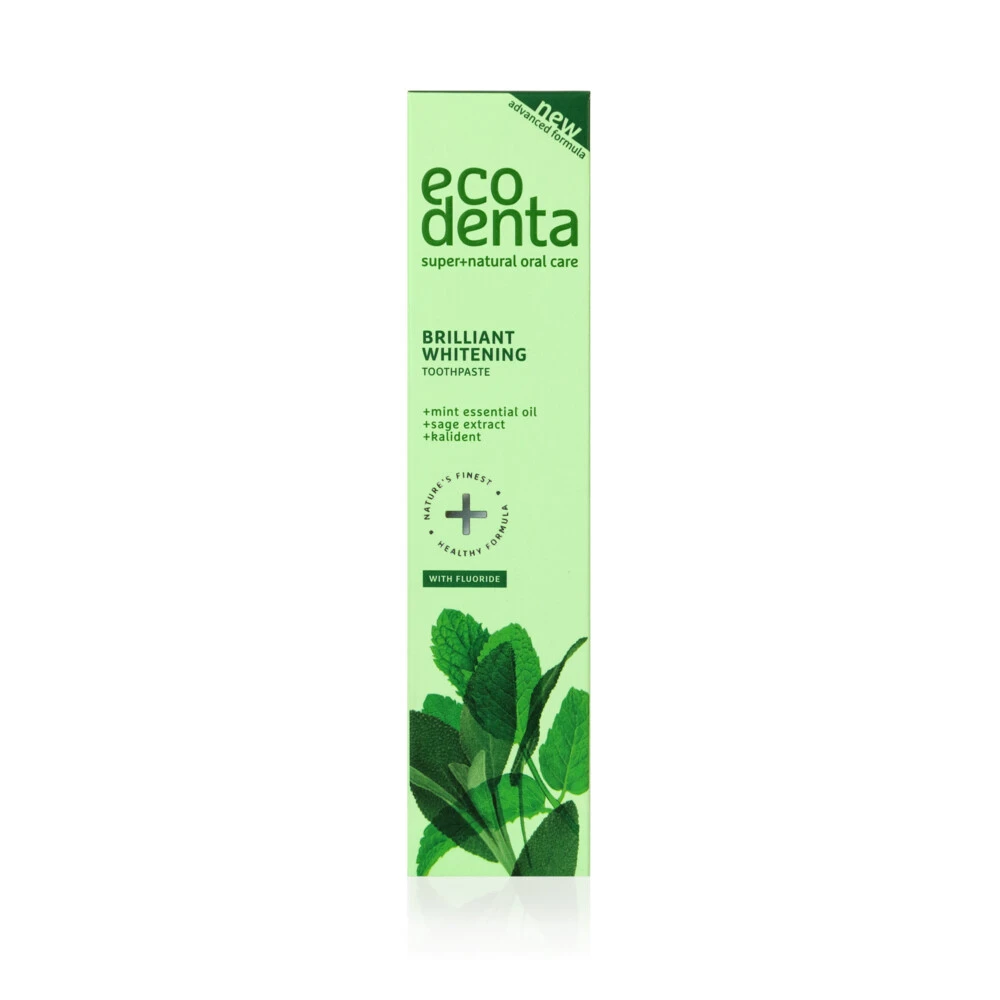 Ecodenta Tandpasta Whitening Muntolie & Salie-extractECODENTA Brilliant Whitening tandpasta zorgt voor natuurlijk wittere tanden. De formule reinigt en bleekt de tanden, zonder het glazuur te beschadigen en beschermt tegen vorming van tandsteen. Kalident elimineert micro-scheurtjes en krasjes in het tandglazuur. Salie extracten helpen het tandvlees te beschermen. De muntolie zorgt voor een heerlijk frisse adem.Natuurlijk witte tandenHelpt het tandglazuur versterkenExtra verfrissing door munt