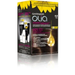 Garnier Olia haarverf 4.8 – Mokka BruinGarnier Olia permanente crèmekleuring geeft 100% grijsdekking en is op basis van 60% oliën. De haarverf geeft jouw haar een intense kleur en zorgt voor een zichtbaar betere haarkwaliteit. De permanente thuiskleuring bevat geen ammoniak wat voor een aangename geur zorgt. De thuiskleuring zorgt voor optimaal comfort voor je hoofdhuid.Garnier Olia beschermd tegen droogheid en maakt je haar 35% zachter. De haarverf is fluweelzacht van textuur, drupt