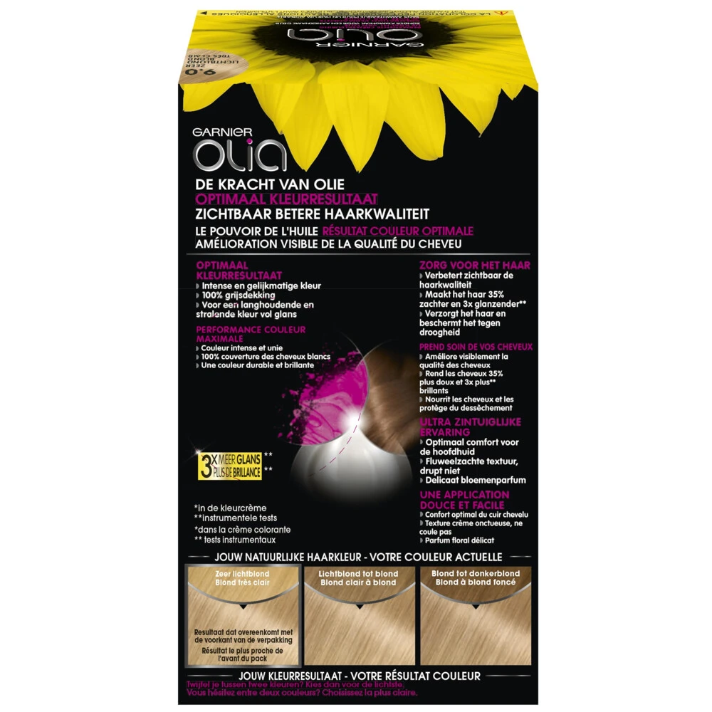 Garnier Olia 9.0 – Zeer Lichtblond – Haarverf:- Intense, levendige en langhoudende kleur- Zichtbaar verbeterde haarkwaliteit, kleur na kleur- 3x Glanzender haar**- 35% zachter haar**- Zonder ammoniak voor een aangename geur- Tot 100% GrijsdekkingErvaar nu de kracht van pure oliën met Garnier Olia!De permanente thuiskleuring met 100% grijsdekking op basis van 60% oliën* geeft het haar een intense kleur, een schitterende glans, en zichtbaar verbeterde haarkwaliteit, kleur