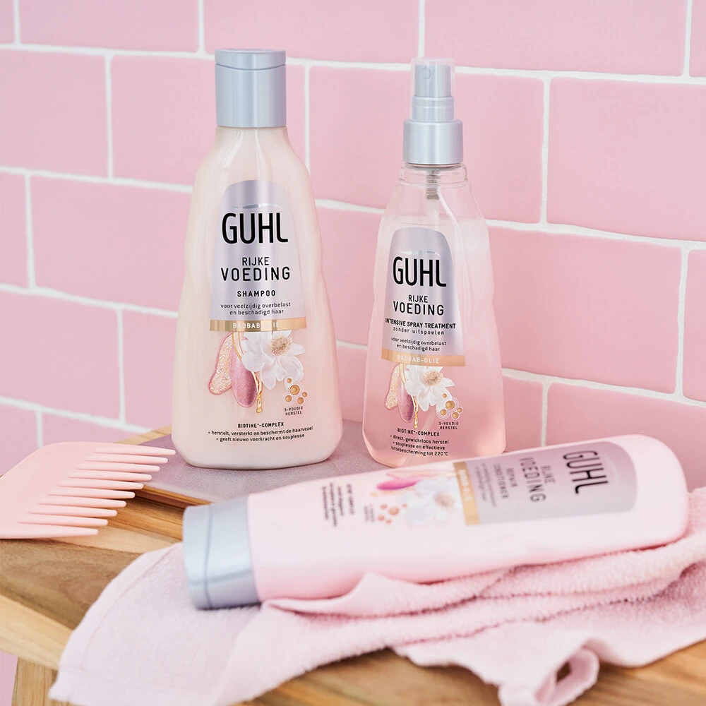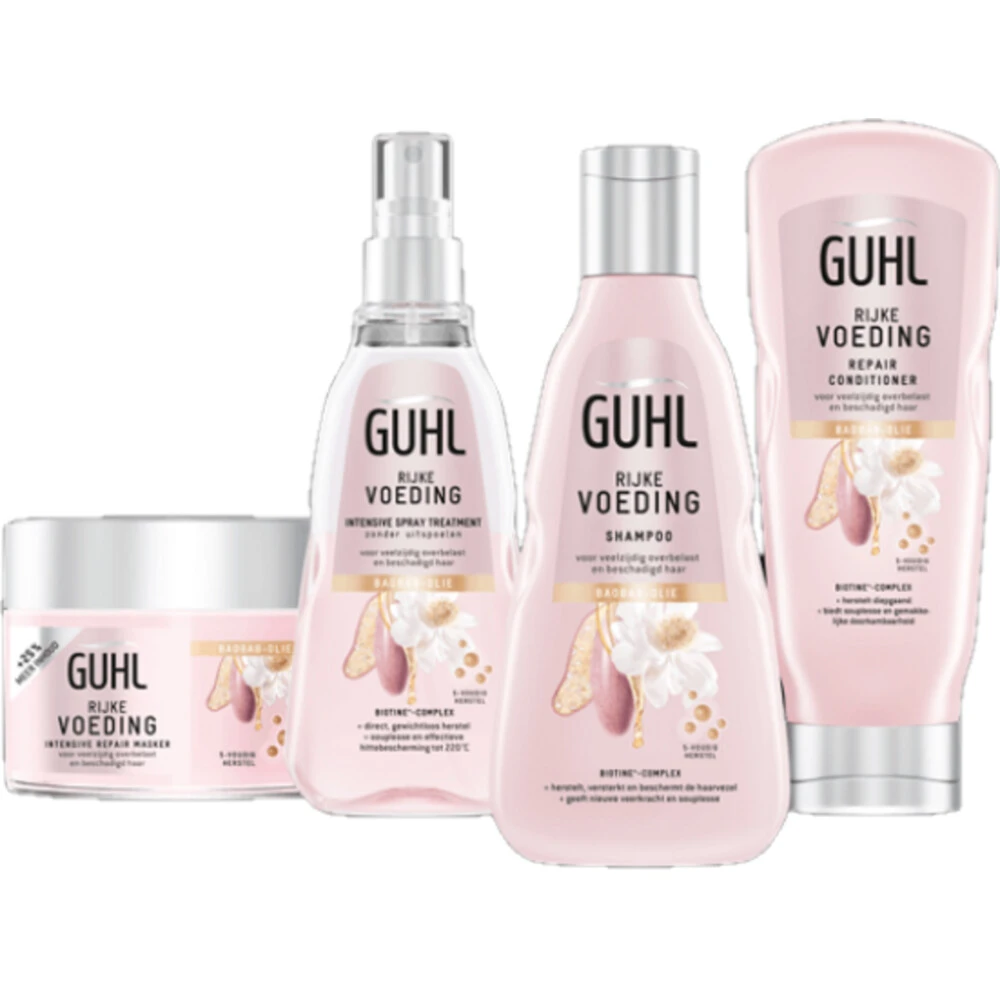 Guhl Rijke Voeding PakketDit pakket met vier Guhl Rijke Voeding producten is gemaakt voor overbelast, breekbaar en beschadigd haar. De producten uit deze lijn, met rijke Baobab-Olie en de Biotine+-Complex hebben voor het eerst een 5-voudige werking. Deze vier producten herstellen beschadigd haar diepgaand, versterken de haarvezels tot in de puntjes en bieden meer weerstand. De holistische formule maakt het beschadigde haaroppervlak glad en voorziet het haar van een beschermende laag om schade te