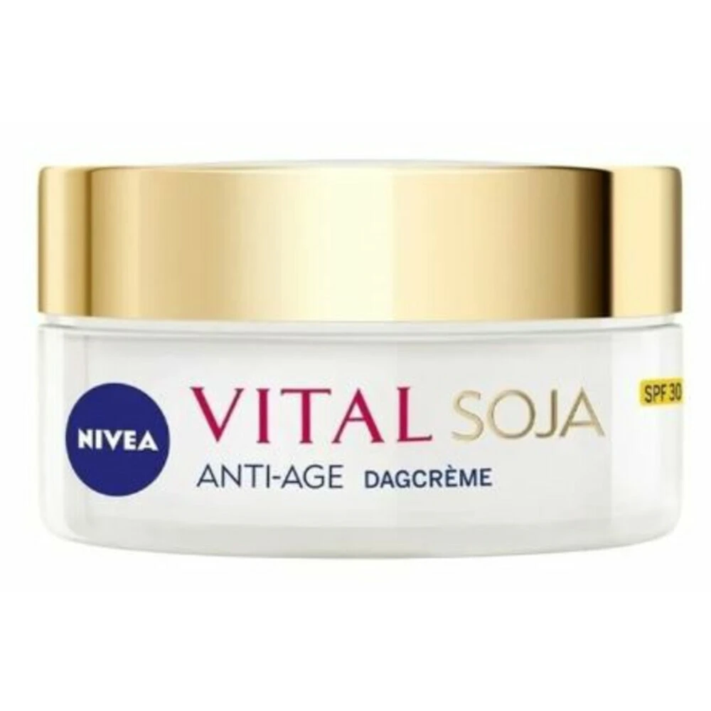 Nivea Dagcreme SPF 30 Vital Soja Anti-Age Dagcreme SPF 30Is verrijkt met sojaproteïnen en ondersteunen het herstelproces van de huid dat in de loop der jaren vertraagt. Deze dagcrème stimuleert de celvernieuwing van de huid en haar vermogen om vocht vast te houden. Resultaat: langdurige rimpelvermindering. Bij regelmatig aanbrengen verkleint het zichtbaar de diepe rimpels en smalle lijntjes. Het vult de huid van binnenuit op en zorgt voor langdurige versteviging.